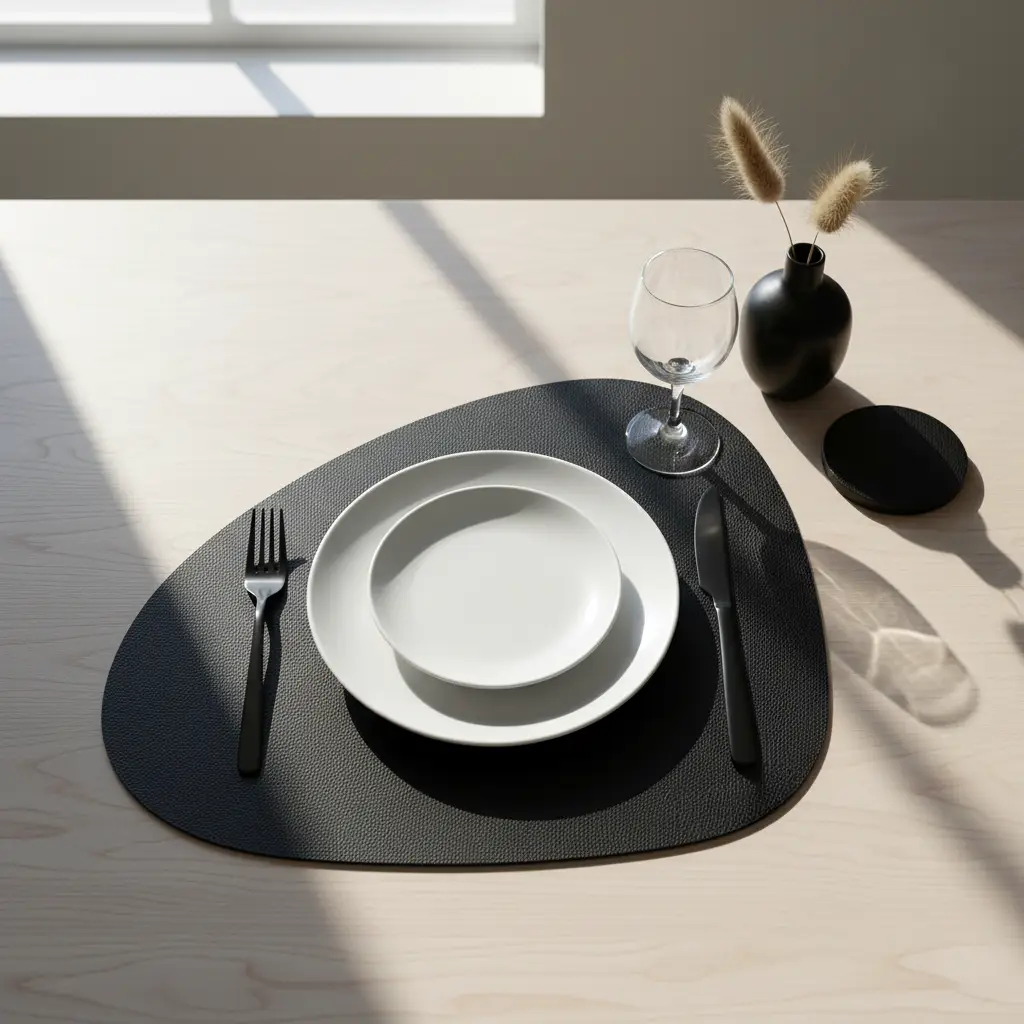 Atrévete a romper con lo convencional y eleva la estética de tu mesa con el Set de 6 Individuales Triangle de PU negro de Blakmher. Su forma orgánica y vanguardista de 43×35 cm, inspirada en las líneas suaves de la naturaleza, ofrece una alternativa moderna y sofisticada al individual clásico, transformando cada comida en una declaración de diseño. Confeccionados en poliuretano de alta calidad, son excepcionalmente duraderos y fáciles de limpiar.