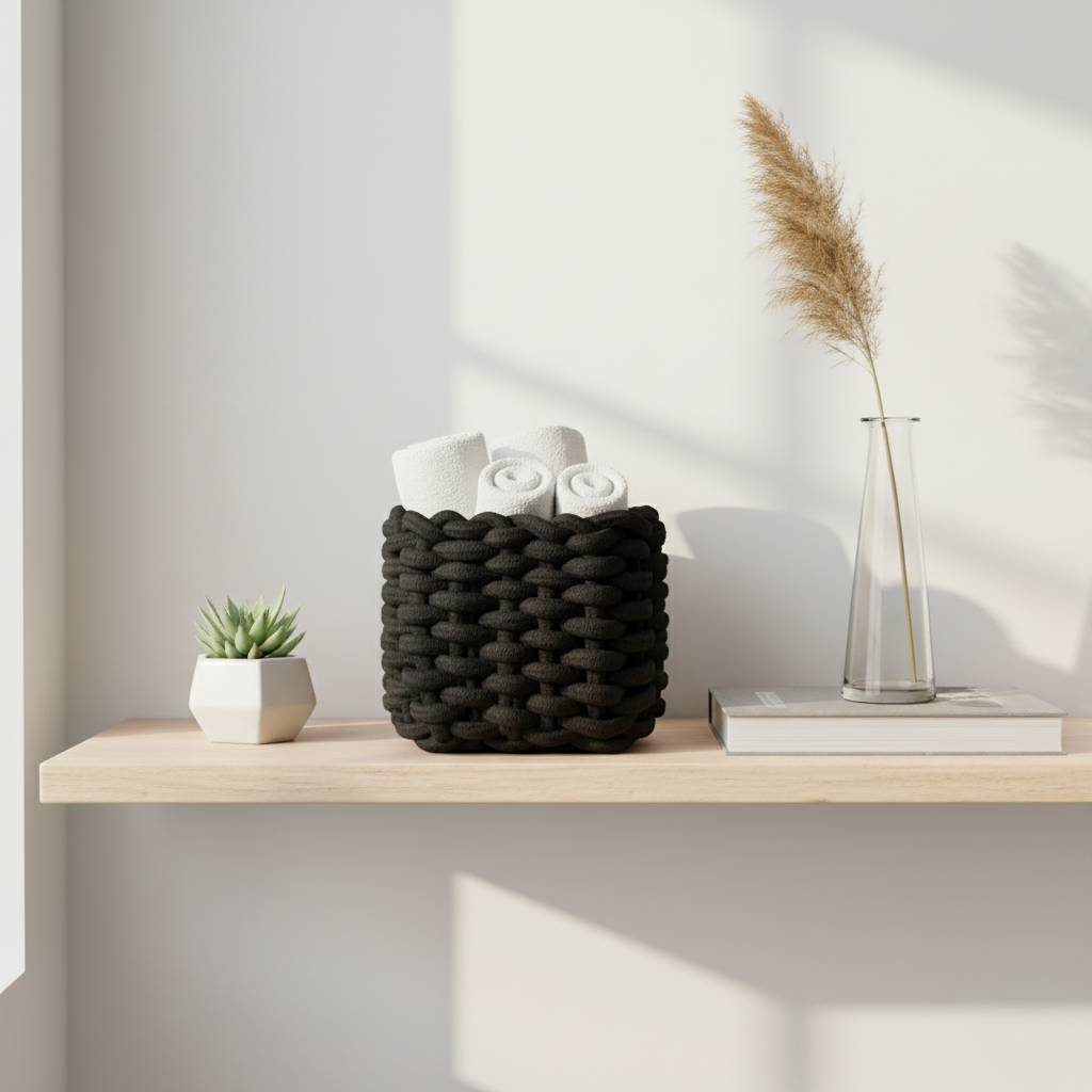 Añade un toque de calidez artesanal y funcionalidad sofisticada a cualquier espacio con el Cesto de algodón Tessuto negro de Blakmher. Con sus dimensiones de 17x17x12 cm, esta pieza destaca por su fascinante tejido a mano con cuerdas de algodón grueso, creando una textura visual y táctil que invita al contacto. Ideal para organizar pequeños objetos, joyas, mandos a distancia o simplemente como elemento decorativo.