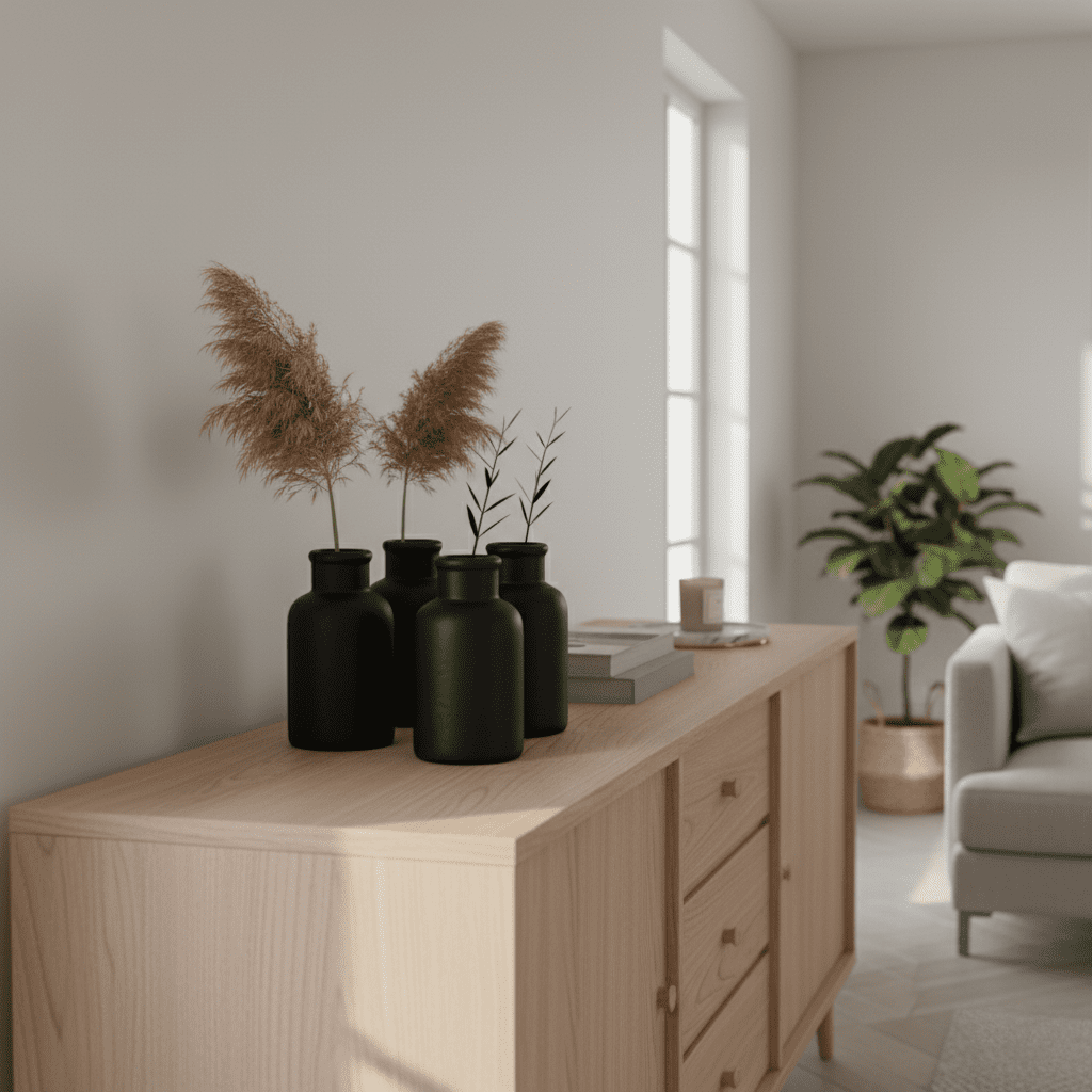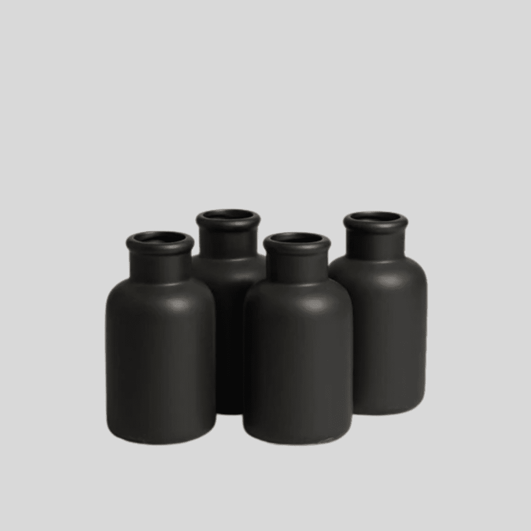 perfecta para añadir un toque de elegancia y sofisticación minimalista a cualquier espacio. Cada uno de los cuatro jarronespresenta un diseño cilíndrico robusto con un cuello corto, y un distintivo acabado negro mate “Tessuto” que realza su forma sobria y moderna. Ideales para la decoración nórdica o industrial, estos jarrones son sumamente versátiles: puedes agruparlos para crear un impactante centro de mesa o distribuirlos individualmente en estanterías, repisas y escritorios para exhibir flores secas, tallos individuales o ramas decorativas con estilo coherente