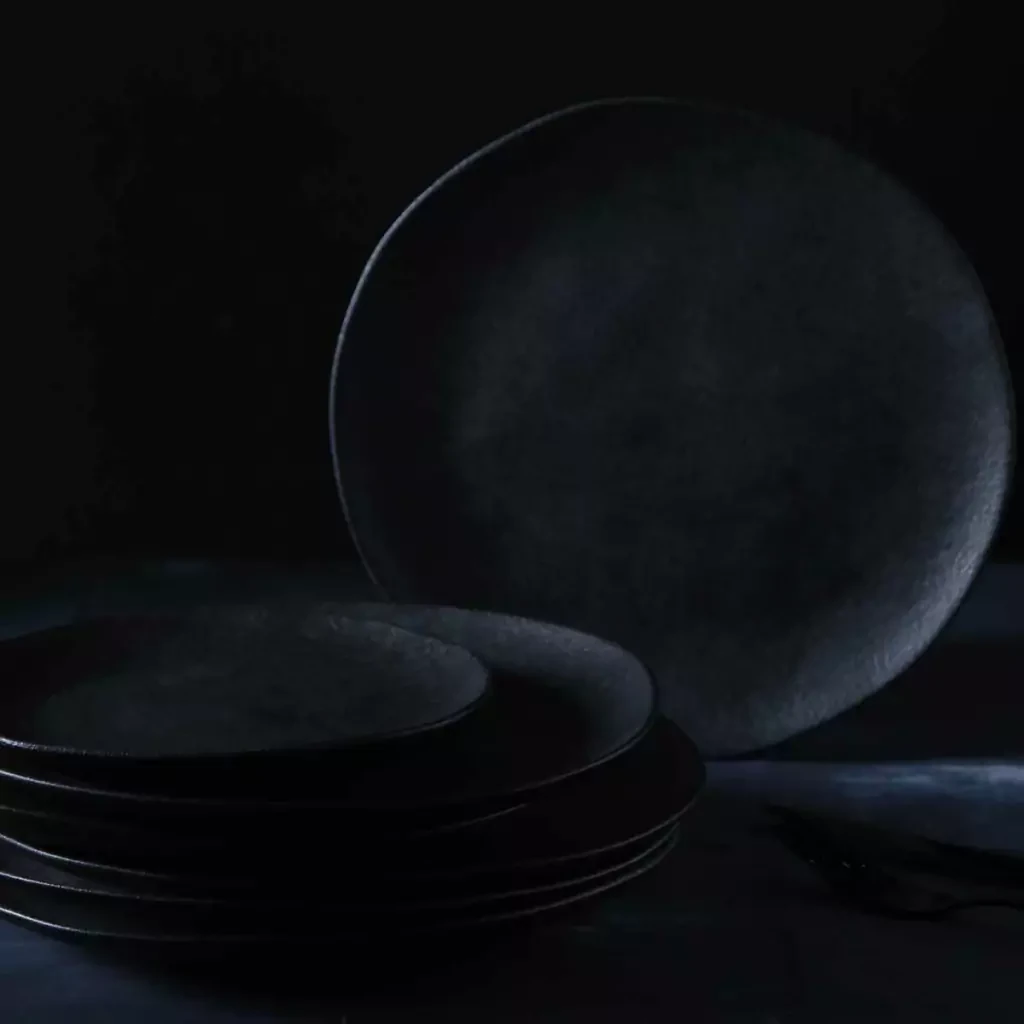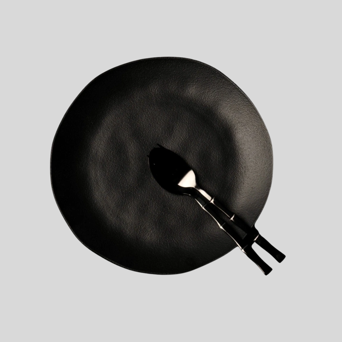 Plato playo de 26,5cm de diametro, acabado orgánico. Terminación opaca, color negro. Material: gres. Apto lavavajillas, microondas y horno. Recomendacion: utilizar cubiertos de aleación dura, para cuidar el plato.