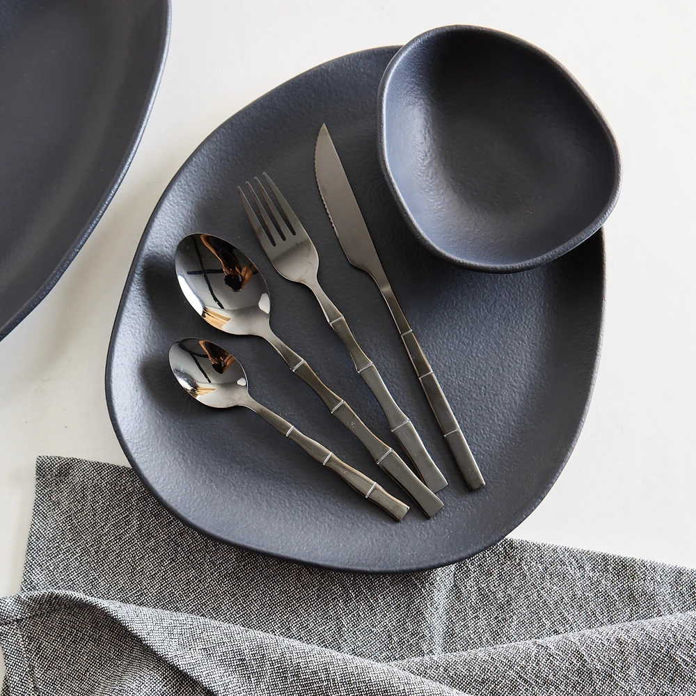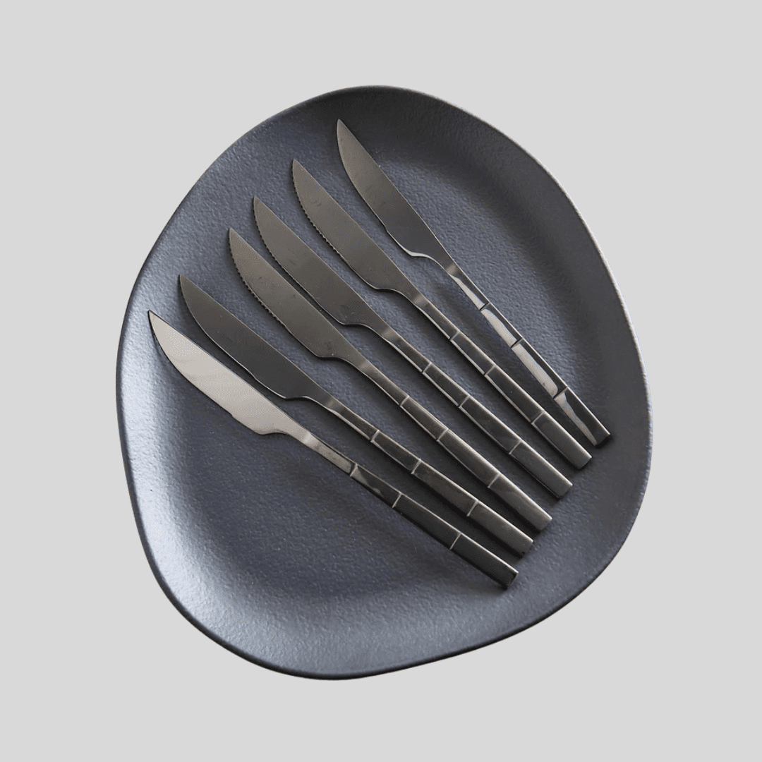 Set de 6 cuchillos de acero inoxidable Línea Bambú, de 23 cm de largo, con acabado negro brillante y mango labrado con diseño tipo bambú. Elegantes y funcionales, aportan un toque contemporáneo a la mesa. Su filo preciso permite un corte cómodo y eficaz. No aptos para lavavajillas. Ideales para combinar con los demás cubiertos de la misma línea y crear una mesa uniforme y sofisticada.