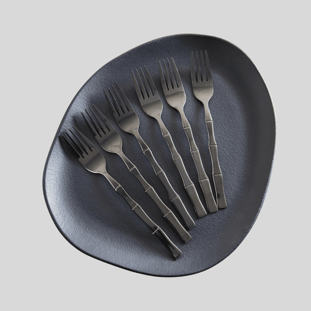 Set de 6 tenedores de acero inoxidable Línea Bambú, de 20 cm de largo, con acabado negro brillante y mango labrado con diseño tipo bambú. Su estilo elegante y moderno los convierte en una pieza distintiva para cualquier mesa. No aptos para lavavajillas. Perfectos para combinar con los cuchillos, cucharas y cucharitas de la misma línea, logrando una presentación armoniosa y sofisticada.