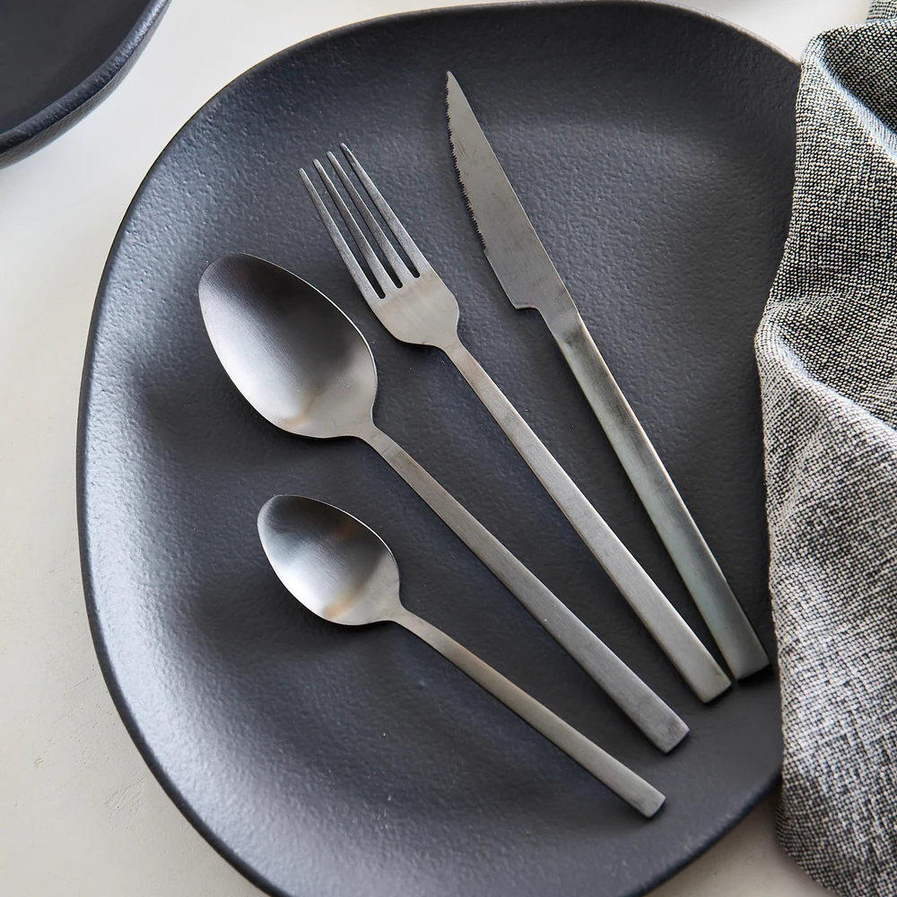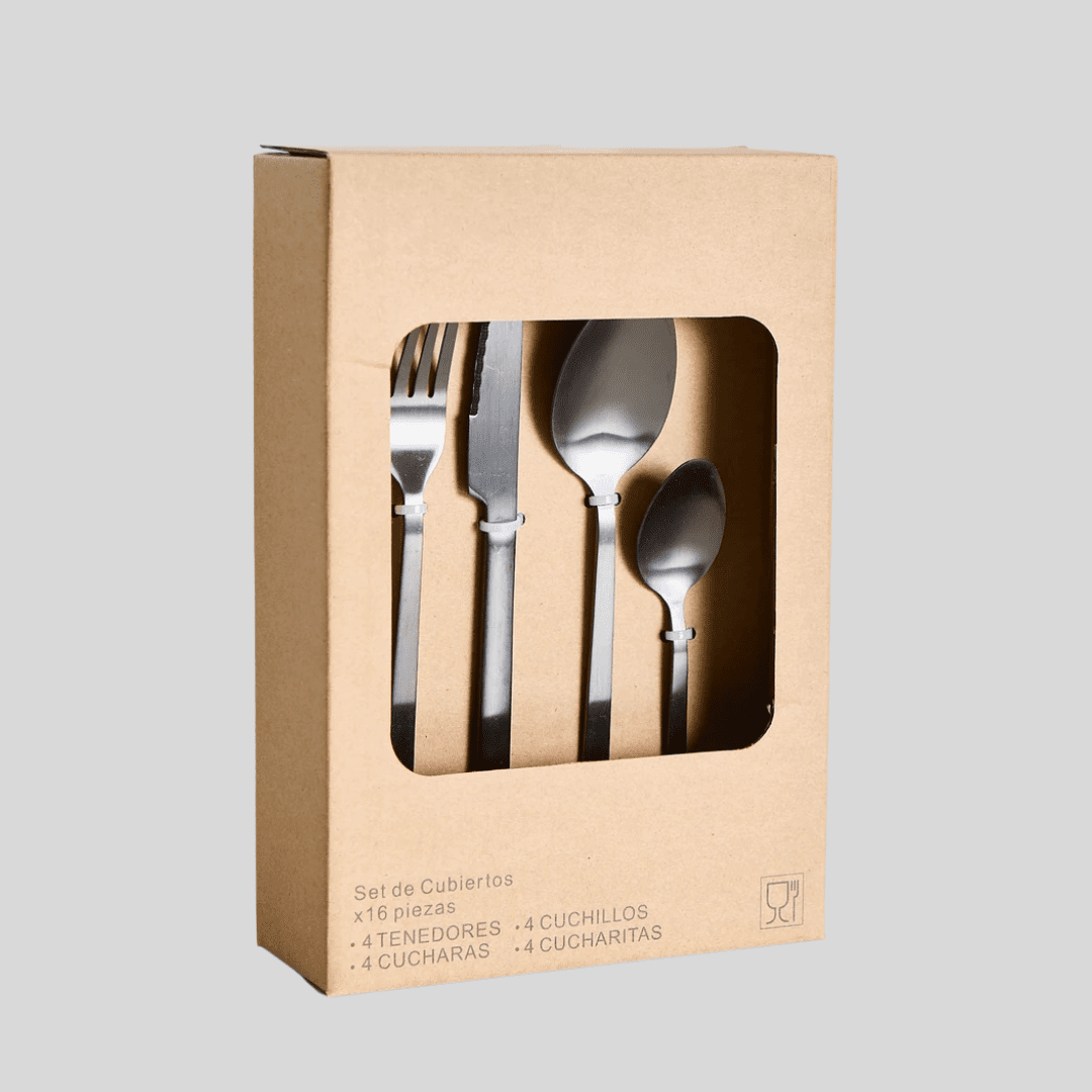 Set de cubiertos Línea Bond en color negro opaco, compuesto por 16 piezas: 4 tenedores, 4 cuchillos, 4 cucharas y 4 cucharitas. Fabricados en acero inoxidable con un acabado mate que aporta elegancia y modernidad a la mesa. Su diseño recto y equilibrado los hace perfectos para uso diario o para acompañar ocasiones especiales, combinando funcionalidad, resistencia y un estilo contemporáneo distintivo.