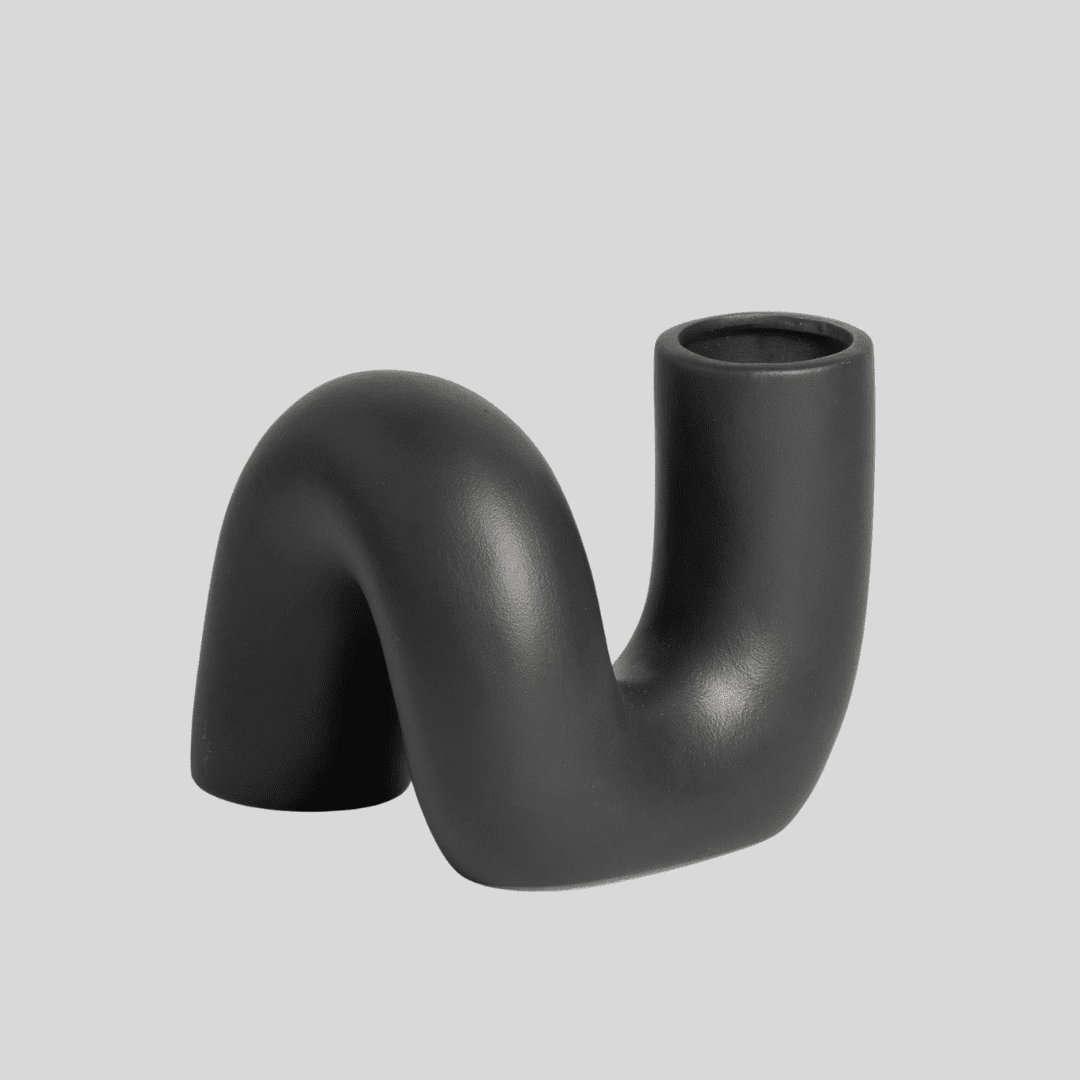 Es una pieza de arte decorativo que desafía las formas tradicionales, perfecta para añadir un toque quirky y moderno a tu decoración. Su diseño inusual, que recuerda a la forma curva de una tubería o una “S” serpenteante, lo convierte en una escultura minimalista por derecho propio. Con su acabado en negro mate, suave y uniforme, este florero de 16 cm de ancho es ideal para estilizar repisas, bibliotecas o escritorios, siendo la elección perfecta para exhibir una única flor o un pequeño manojo de ramas secas con una estética vanguardista y sofisticada.